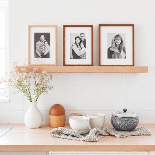 Add family photos to your Scandinavian kitchen to make it feel more personal and warm. Simple frames with black and white pictures can keep the minimalist vibe while adding character to the space.