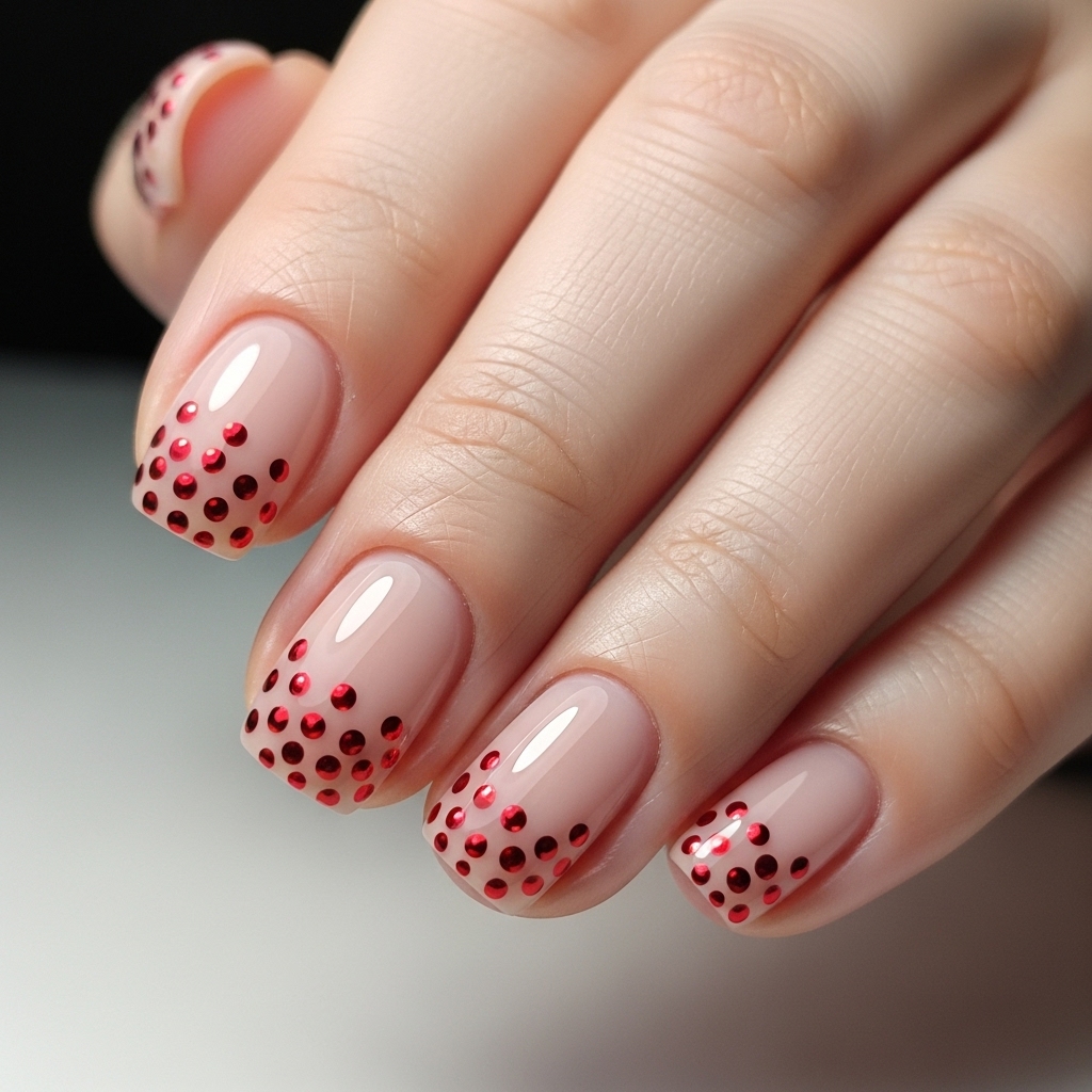A playful yet chic design using soft nude as a base and tiny red dots resembling holly berries.