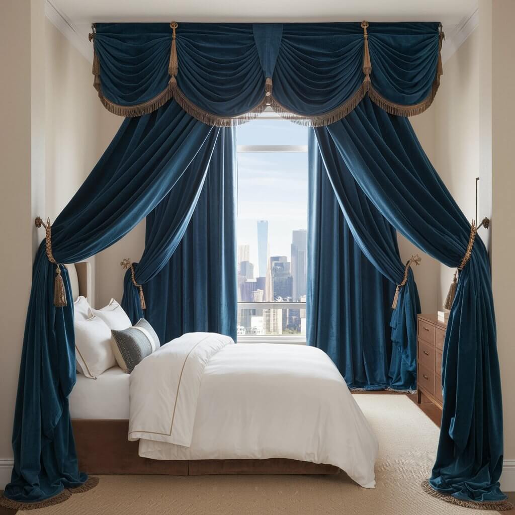 Answer: Heavy drapes, made of thick materials like velvet, help keep the bedroom warm and insulated. They also reduce noise and block out light, creating a cozy and peaceful environment.