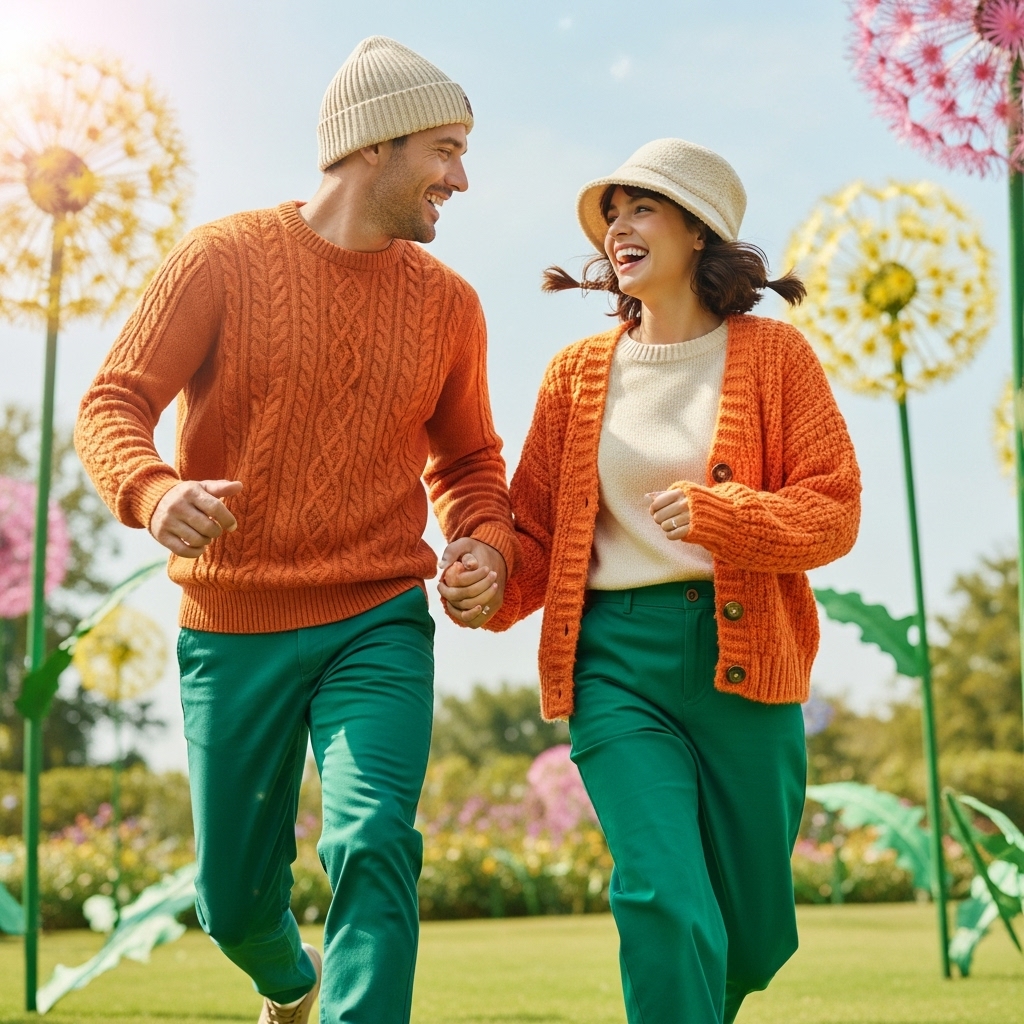 Tangerine sweater; evergreen pants; cream hat. Kid-approved energy.