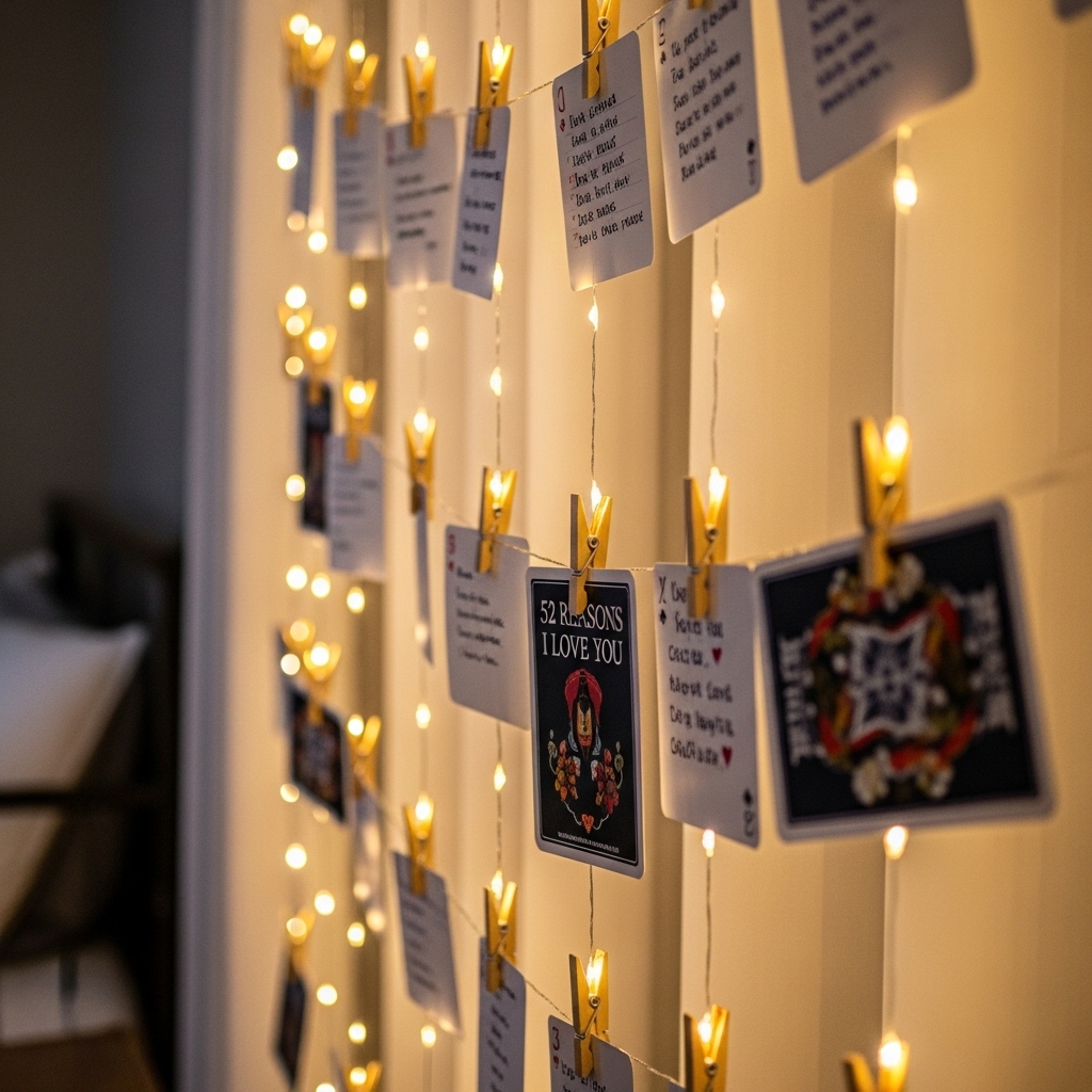 Hang vertical strands of fairy lights from the curtain rod. Use small wooden clothespins to attach love notes or playing cards (from a “52 Reasons I Love You” deck) directly to the lit wires.