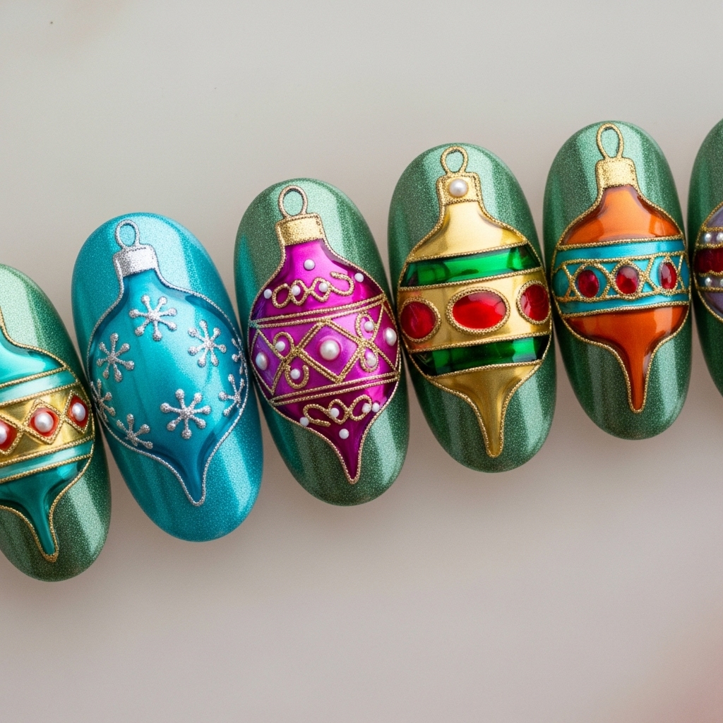 Each nail depicts a different retro bauble, turquoise, magenta, gold—painted over a chrome evergreen base. The kitsch is curated, not chaotic, thanks to uniform oval shaping.