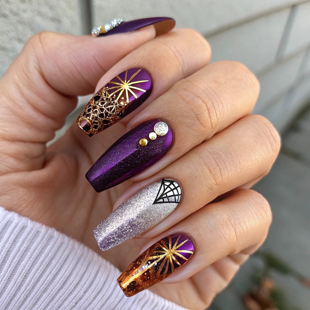 For those who want a more elegant Halloween look, metallic purples, deep plums, and jewel tones with gold, silver, or copper accents are trending.