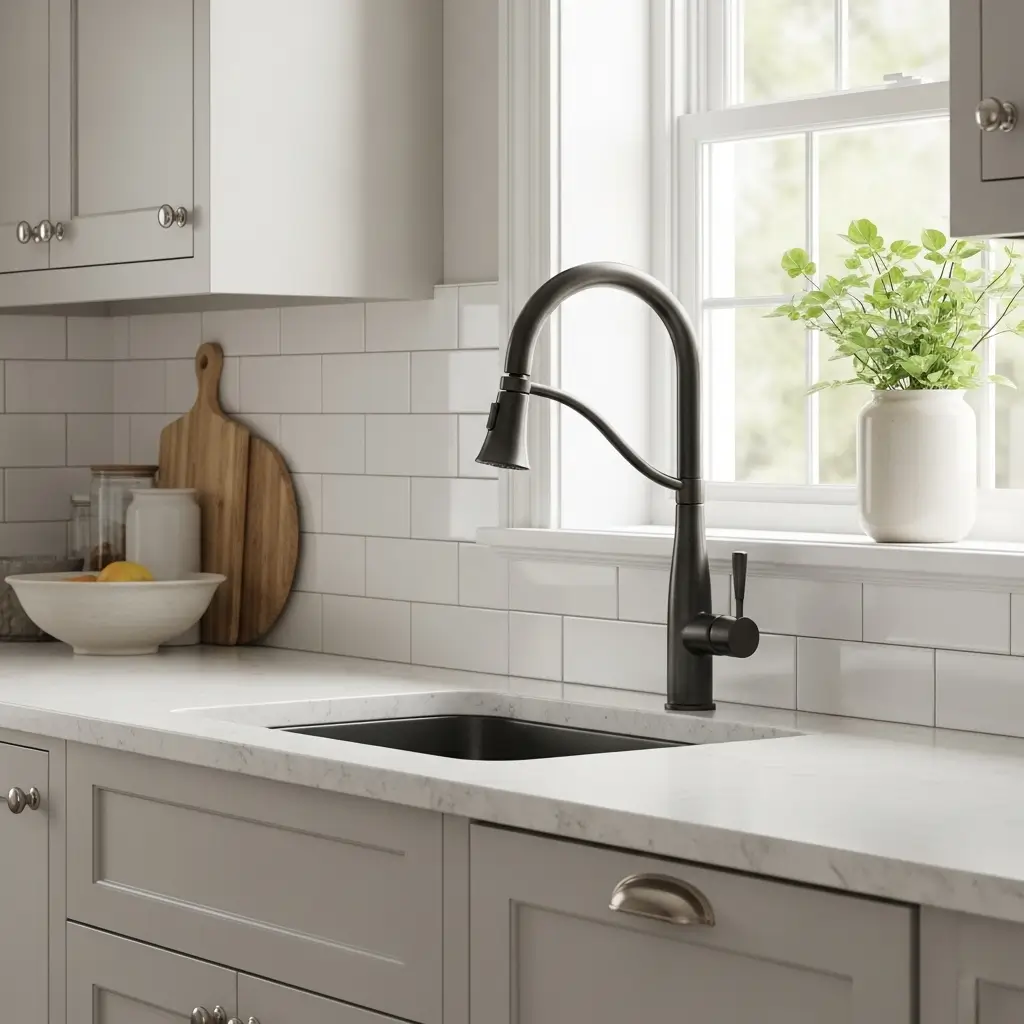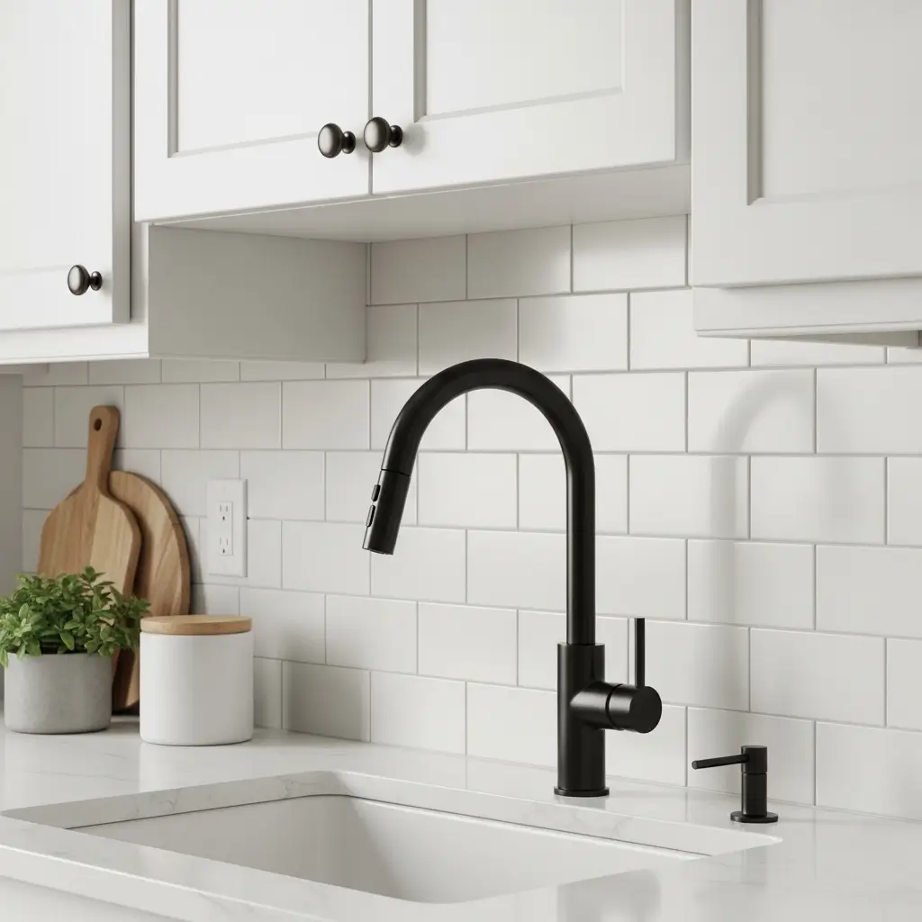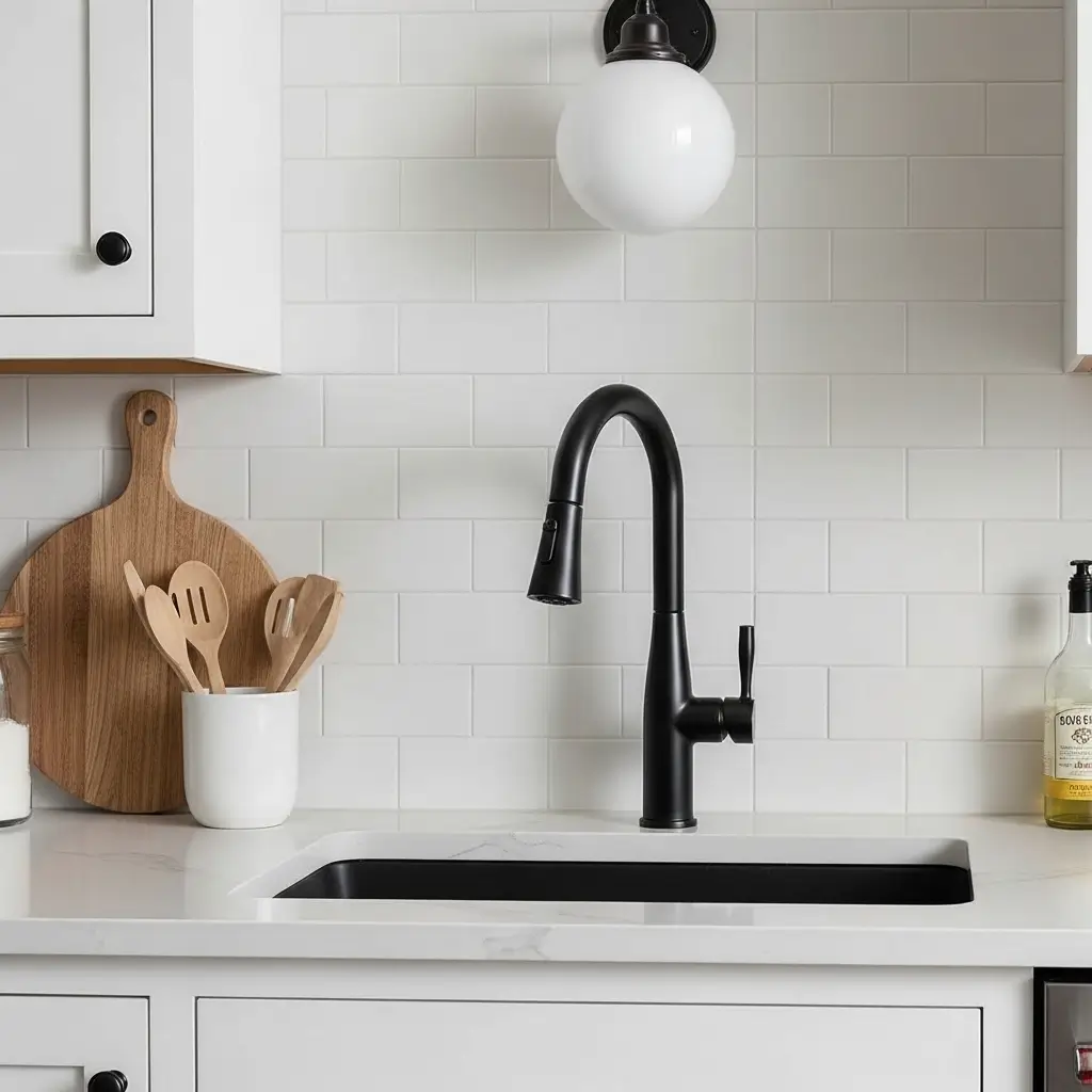Try pairing a soft, matte white subway tile with a bold, matte black kitchen faucet.