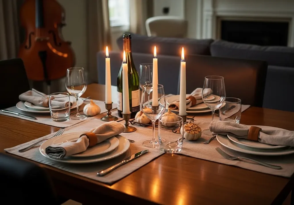 Light a few unscented taper candles. Unscented is crucial here; you do not want a vanilla candle competing with the smell of roasted garlic. Dim the overhead lights and put on some soft background jazz.