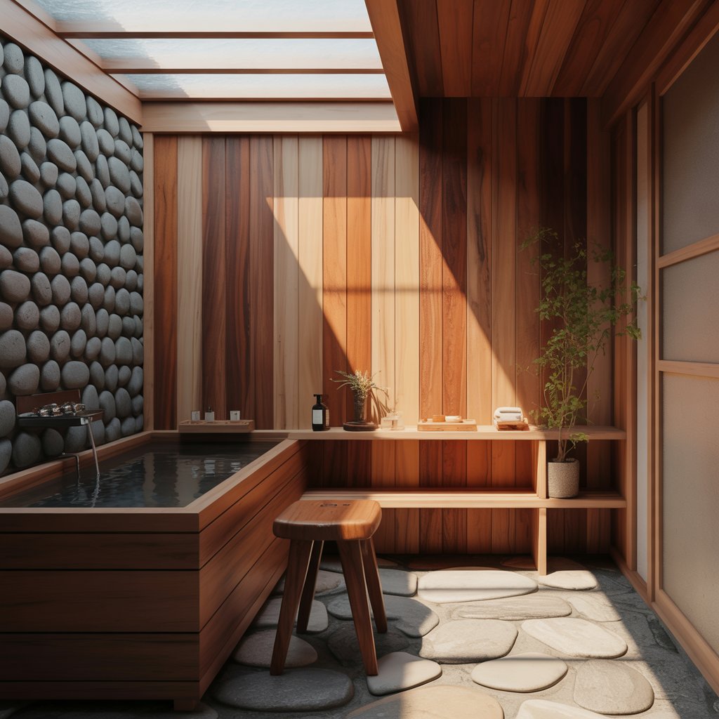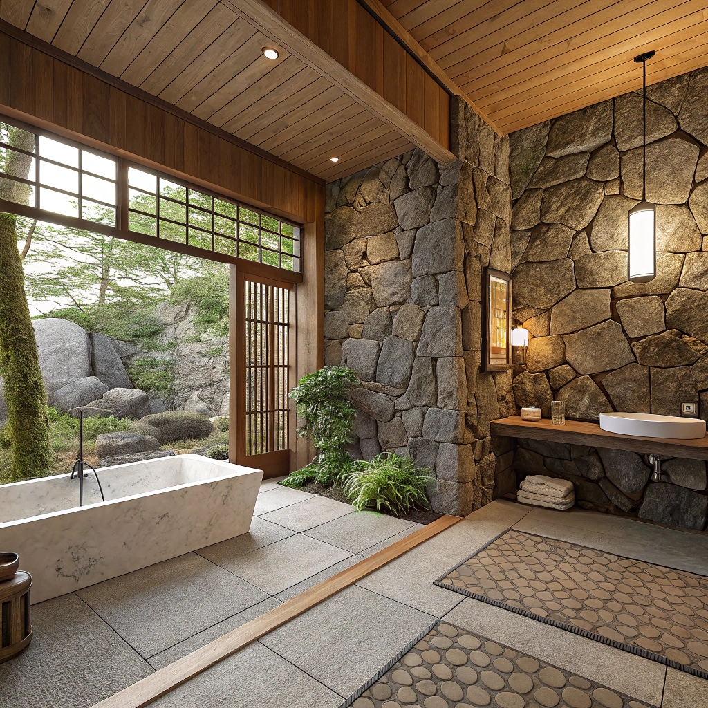 Stone walls are easy to maintain and can withstand the humid environment of a bathroom. This makes them a practical option for a Japanese-style bathroom, combining beauty with functionality.