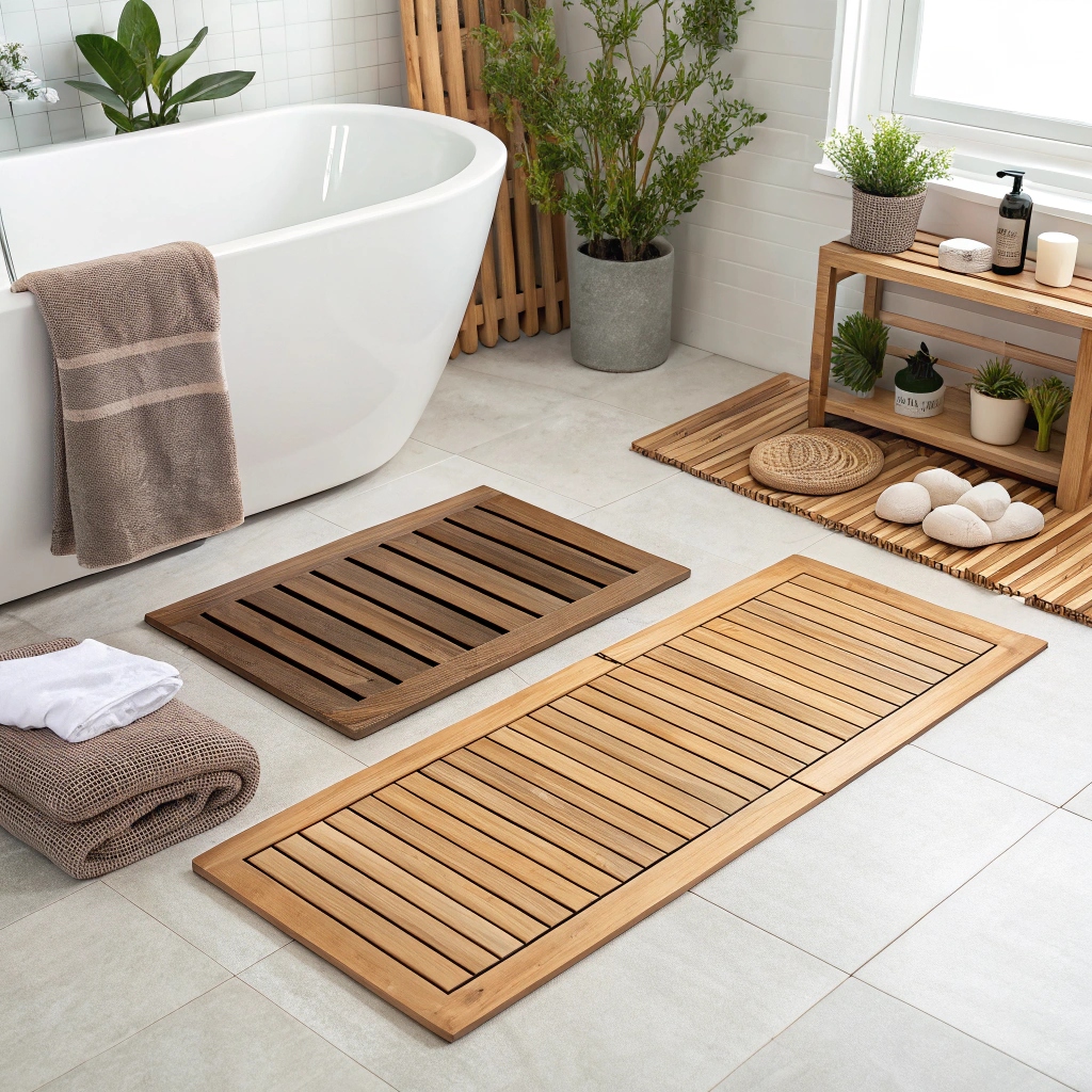 Wooden bath mats are a great way to bring a touch of nature into your bathroom. They are made from materials like bamboo or teak, which are known for their durability and resistance to water. This makes them a long-lasting choice for any bathroom.