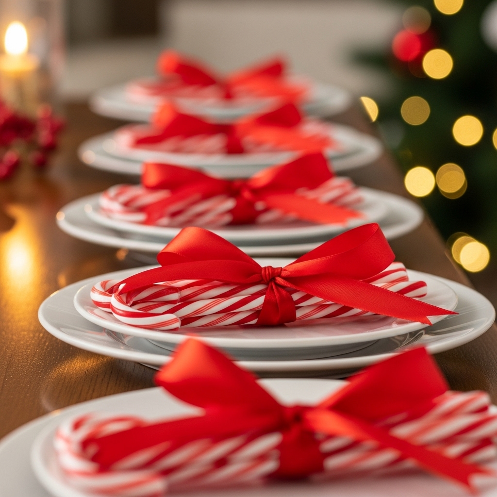 Tie candy canes with satin ribbons at each plate for a classic holiday look that doubles as a treat, costing about $5 for a pack.