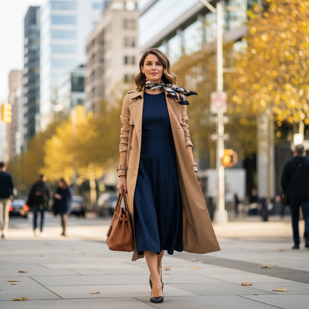 Long trench coat over any base dress elevates workwear dramatically.