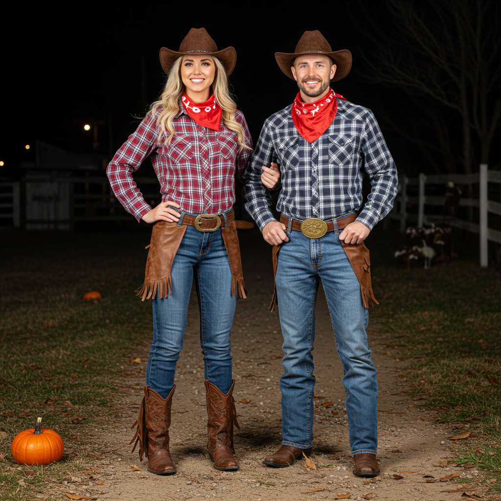 Western-themed costumes featuring jeans, boots, hats, and plaid shirts. This timeless look suits casual and creative Halloween celebrations and works well with DIY props (e.g., toy horses). Great for couples who appreciate classic Americana style.
