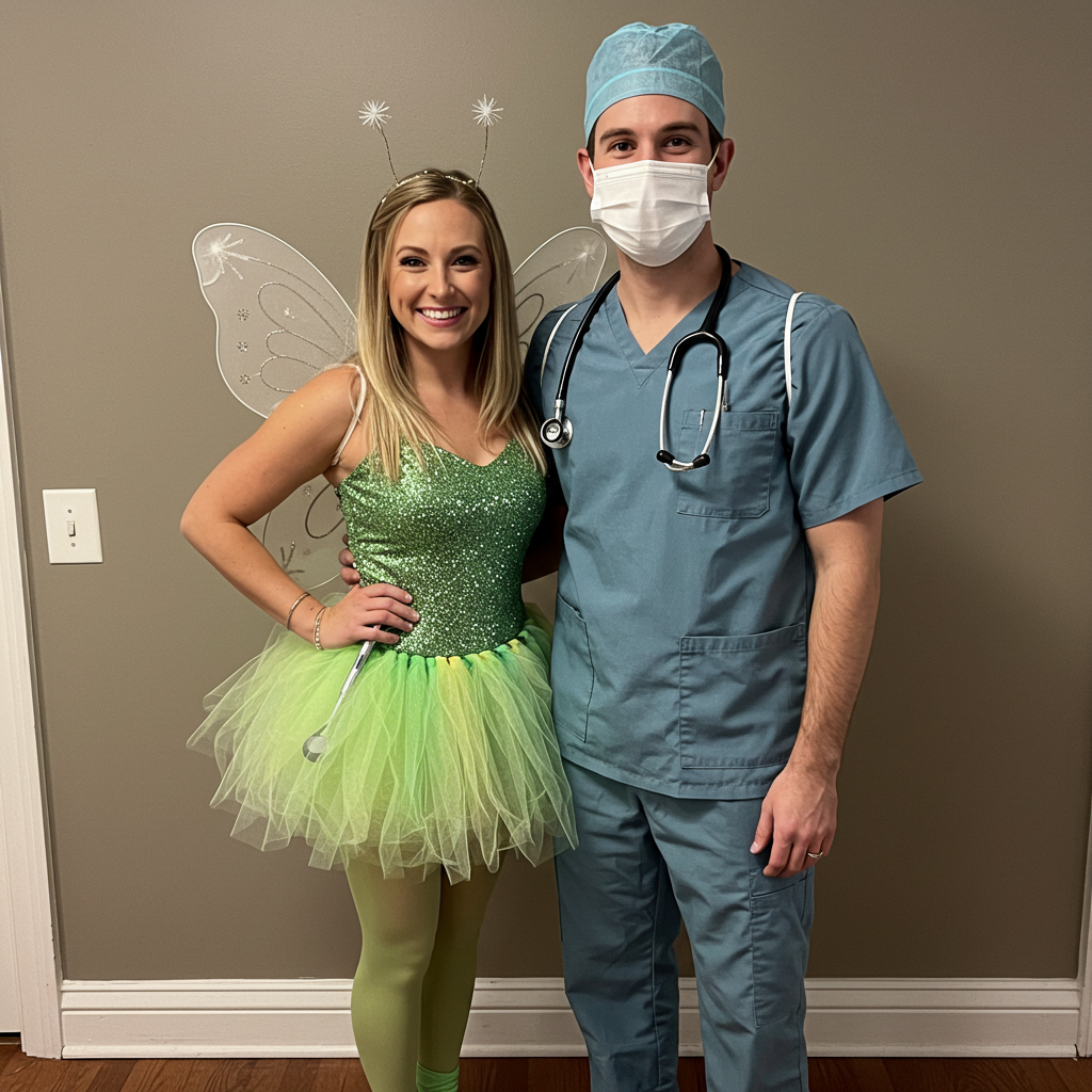 Uncommon yet accessible, this duo blends fantasy and reality. The tooth fairy costume involves sparkle, wings, and a tutu or dress, while the dentist wears scrubs and carries dental tools. It’s a unique couple costume that’s fun to make and themed perfectly for those who want a playful Halloween approach.